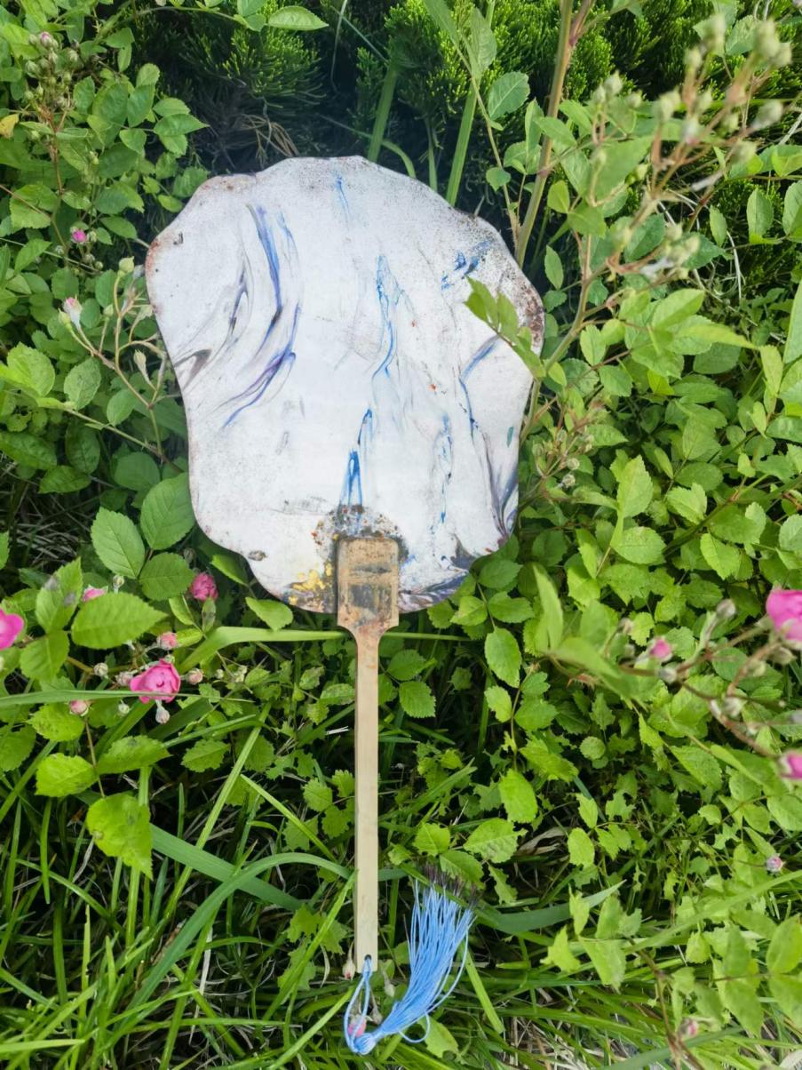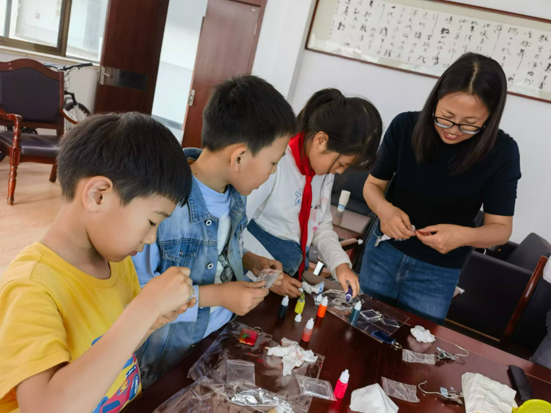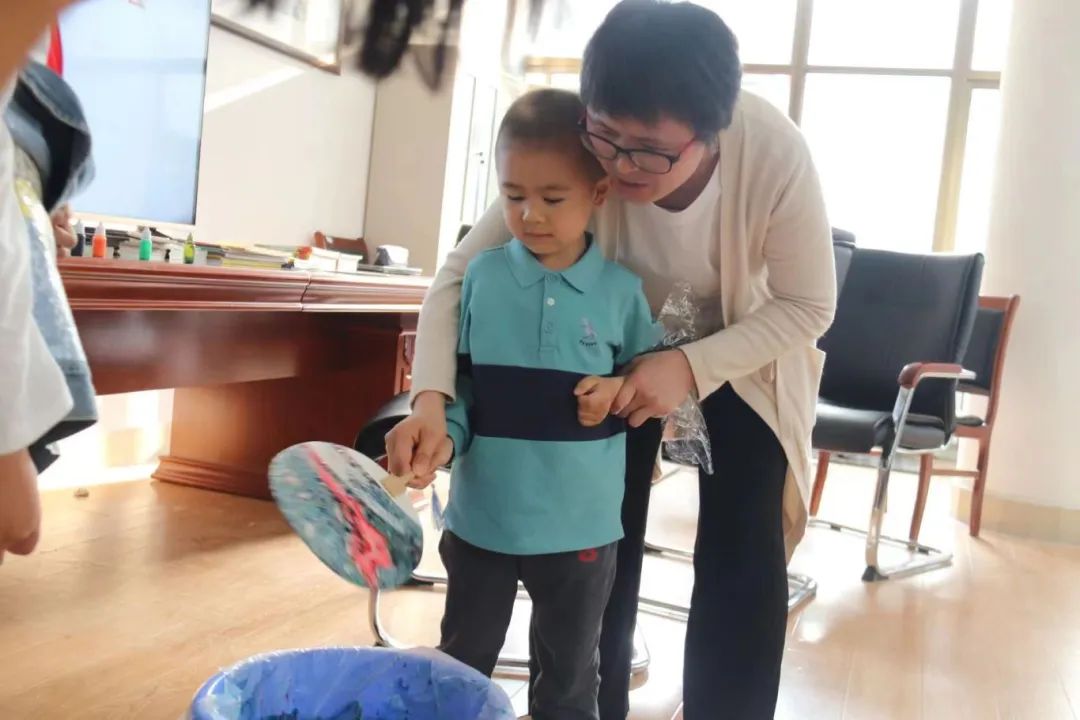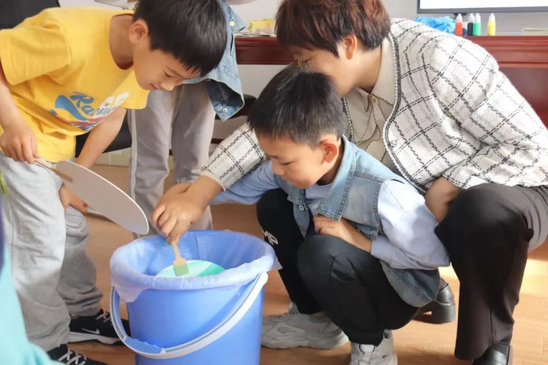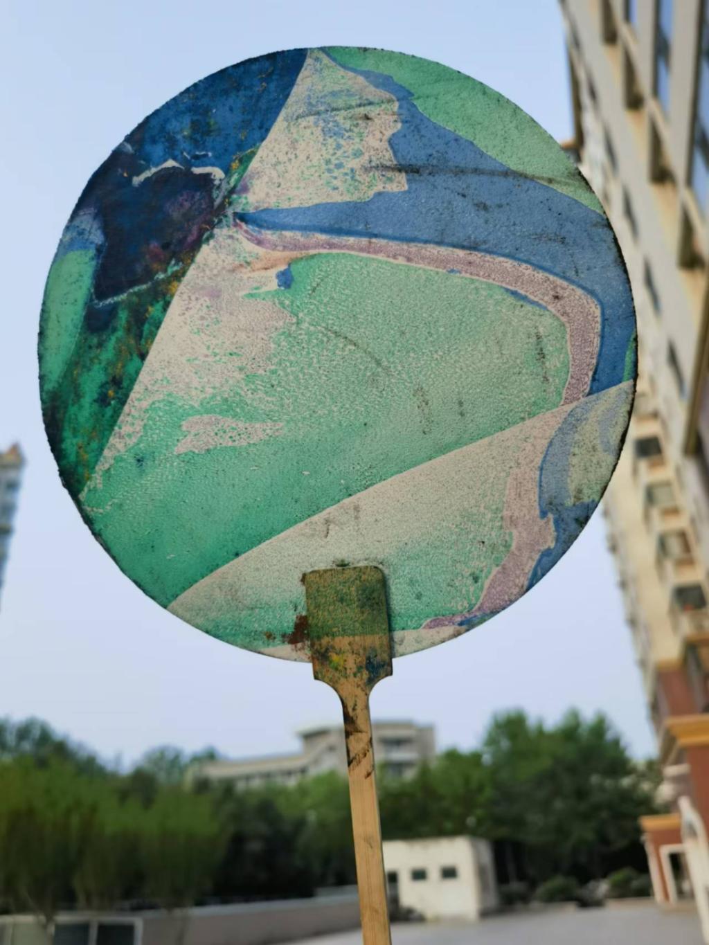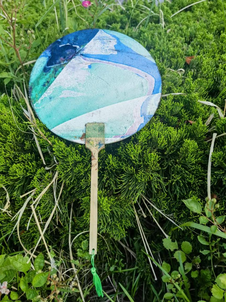教师与孩子共同制作漂漆团扇,制作中,先让漆漂在水面上,一吹、一搅,配合滑动技巧,漆在扇面上穿插与交织,汇成了一幅幅绚丽的扇面。漂漆是中国漆技艺中一种流动的艺术,利用漆自然的随机流动,形成发散的图纹,展现独一无二的色彩与美丽。